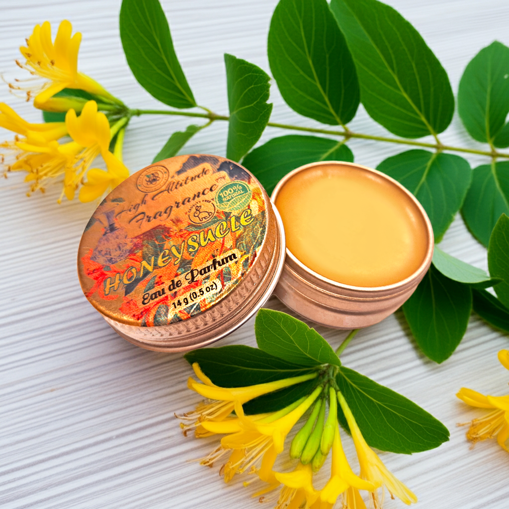 HONEYSUCKLE Solid Perfume Balm is formulated with plant-derived, biodegradable fragrances, natural essential oils and plant extracts, plant natural waxes, plant carrier oils, and natural beeswax.
