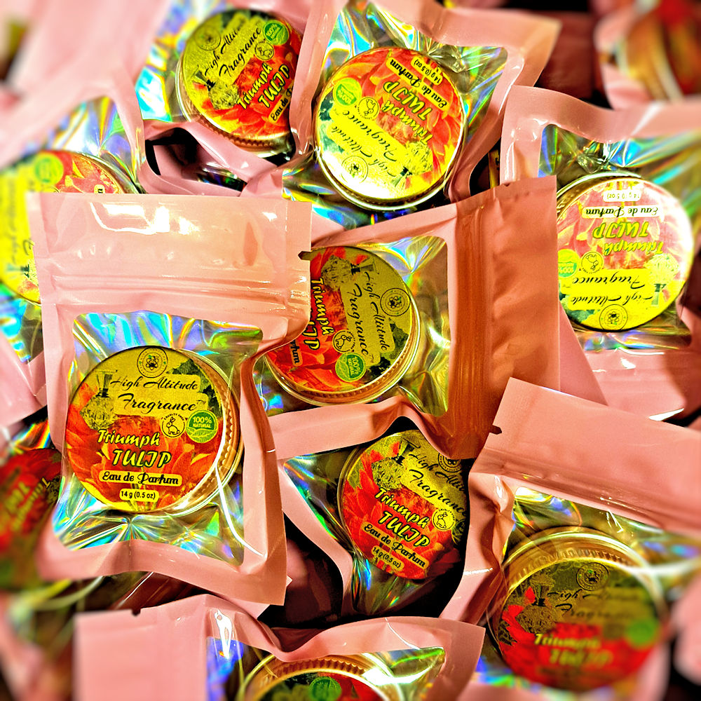 TRIUMPH TULIP Solid Perfume Balm is formulated from plant-derived, biodegradable fragrances, natural essential oils and plant extracts, plant natural waxes, plant carrier oils, and natural beeswax.